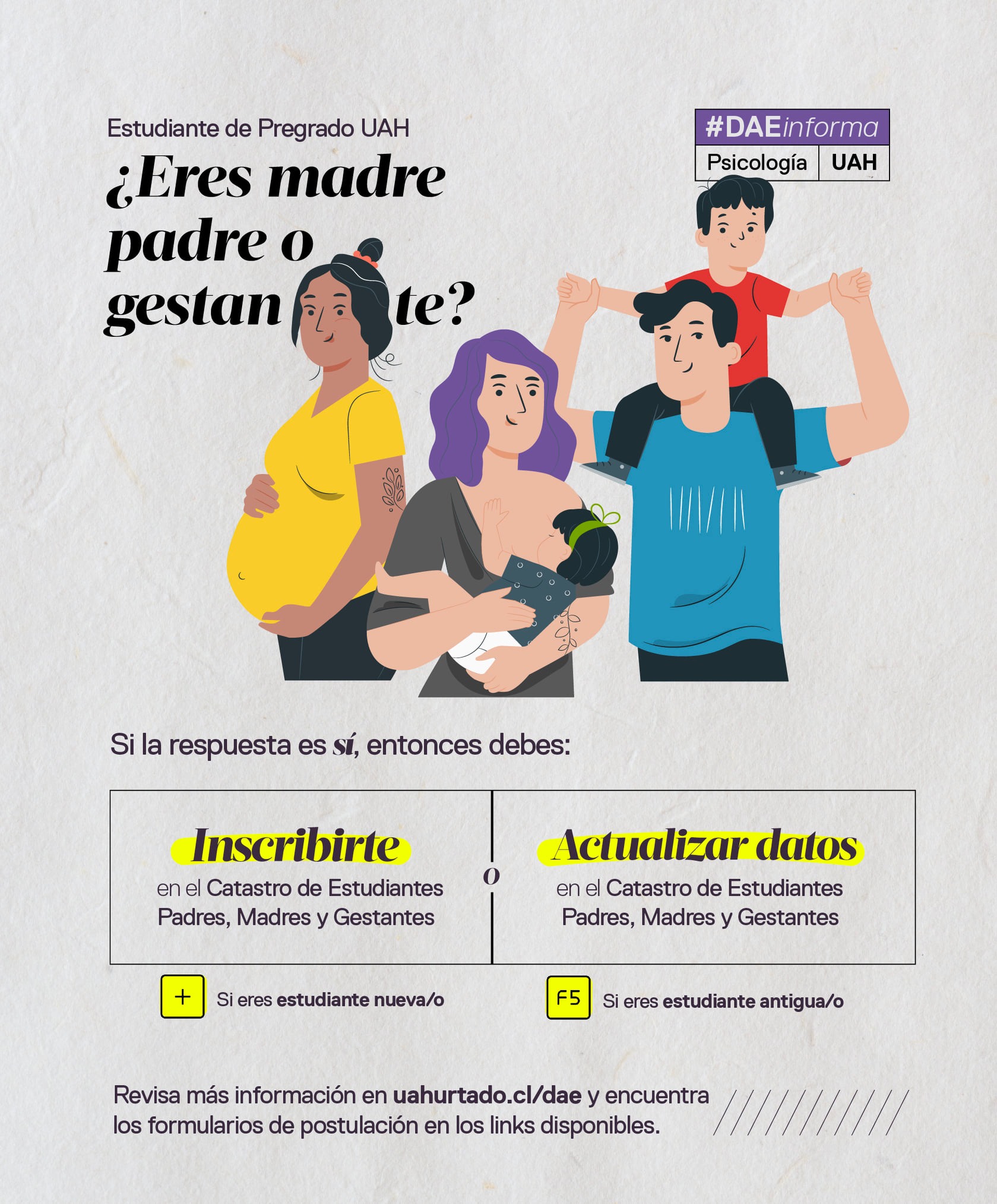 La Universidad Alberto Hurtado, en el marco de la Política de Asignación Preferente para estudiantes de pregrado en situación de maternidad-paternidad y gestación, convoca a los/as estudiantes padres-madres con hijos/as de hasta 12 años de edad y a estudiantes gestantes, a inscribirse en el Castro Institucional, lo cual permitirá el acceso a los siguientes beneficios: